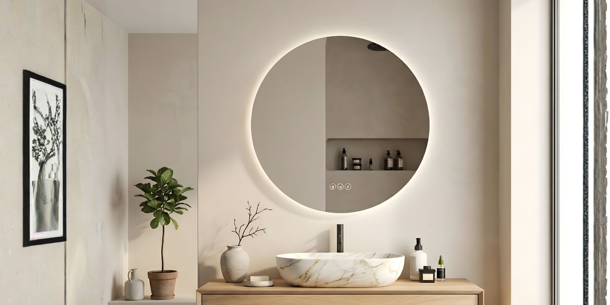 Koniseur LED-spegel med antidim som är rund med horisontal botten. En premium…