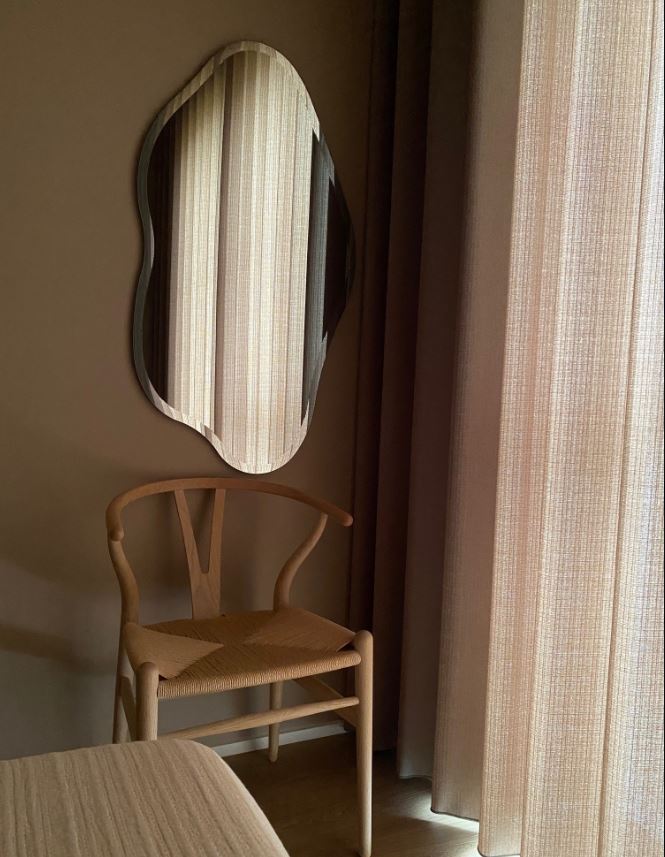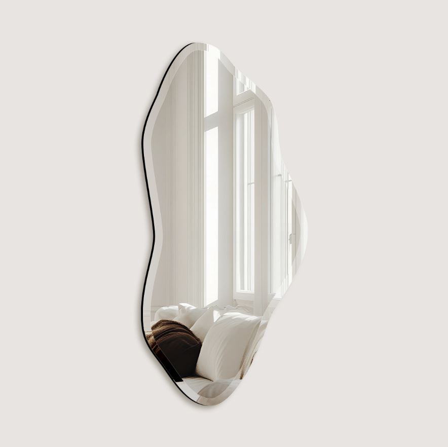 Halo är inte en vanlig spegel. Den har en mjuk, ojämn form som gör att den ser mer ut som konst än bara en spegel. Samtidigt har den en fasettslipad kant som reflekterar ljuset och ger en lyxig känsla.