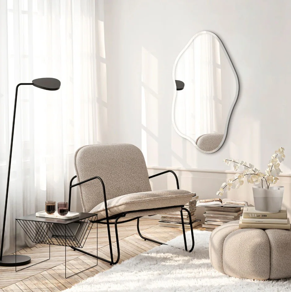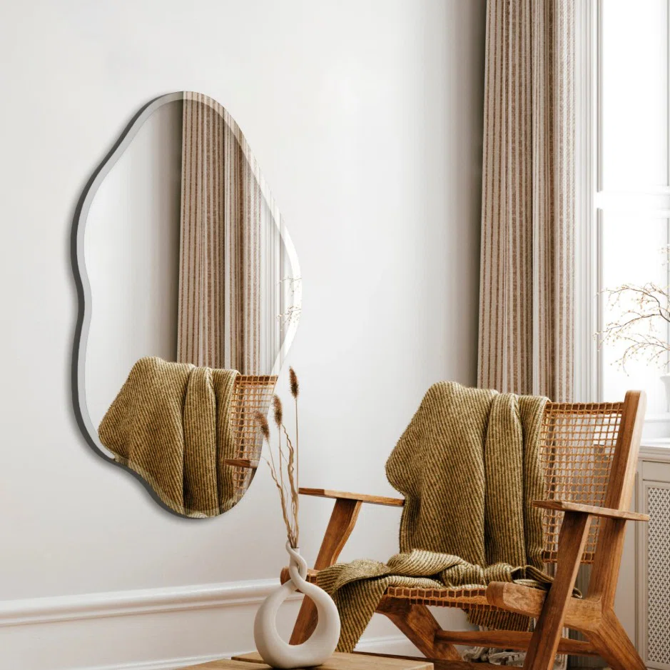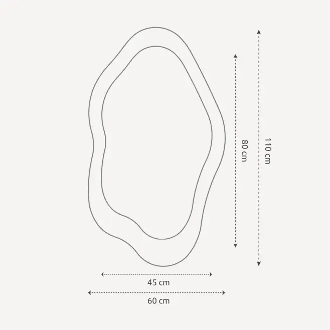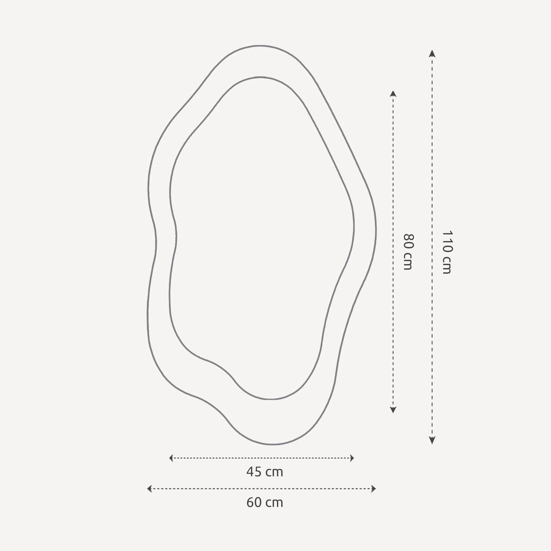 Med sin flytande och oregelbundna form ger spegeln ett konstnärligt uttryck som bryter av mot raka linjer och traditionella former. Perfekt för dig som vill skapa en personlig och modern inredning.