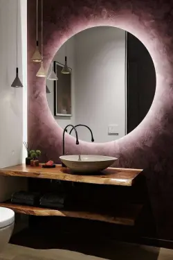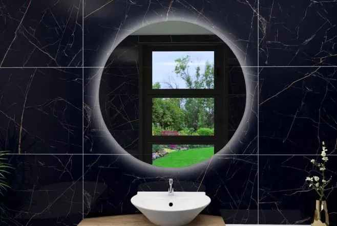 Rund badrumsspegel från Galakor med integrerad LED-backlight belysning. Spegeln har slipade kanter utan någon ram, vilket gör att spegeln ger ett knivskarpt intryck på väggen. Spegeln är tillverkad av bly- och kopparfritt spegelglas. Belysningen ansluts till fast elinstallation och skall installeras av behörig elektriker.
