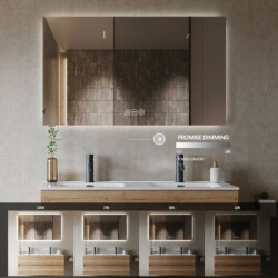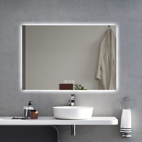 Modern och stilig badrumsspegel med LED-bakgrundsbelysning. Spegeln är utrustad med uppvärmning bakom glaset, som gör att spegeln håller sig imfri. Spegeln tänds och släcks med hjälp touchsensor inbyggd i glaset, där man även justerar ljustemperaturen genom att hålla fingret på knappen. Spegeln levereras med kabel med stickkontakt och ansluts antingen till eluttag eller i ett lamputtag. Vid fast inkoppling skall spegeln installeras av behörig elektriker.