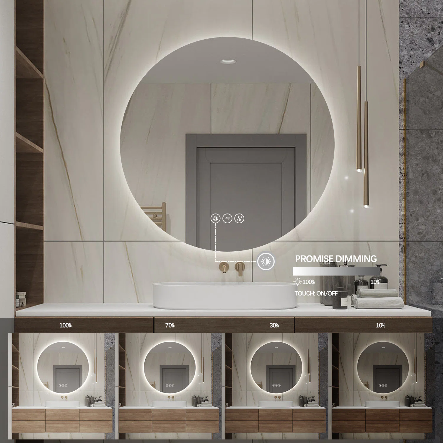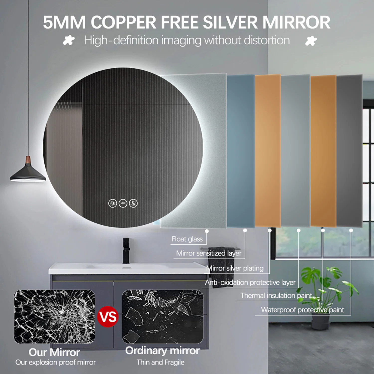 Spegeln är tillverkad av 5mm tjockt härdat, silver- och kopparfritt glas. Spegelns kanter är slipade, vilket gör att spegeln uppskattas som väldigt skarp. Spegelns elektriska delar är IP44-klassade och alla metalldelar är korrosionsbehandlade för maximal livstid, vilket är extra viktigt för badrumsspeglar. Belysningen är vattentät och LED-drivern är av hög kvalitet med minnesfunktion för ljusinställningen. Med hjälp av spegelns belysning får ni en utmärkt ljuskälla i badrummet, samtidigt som backlighten lyser upp utan att blända er.