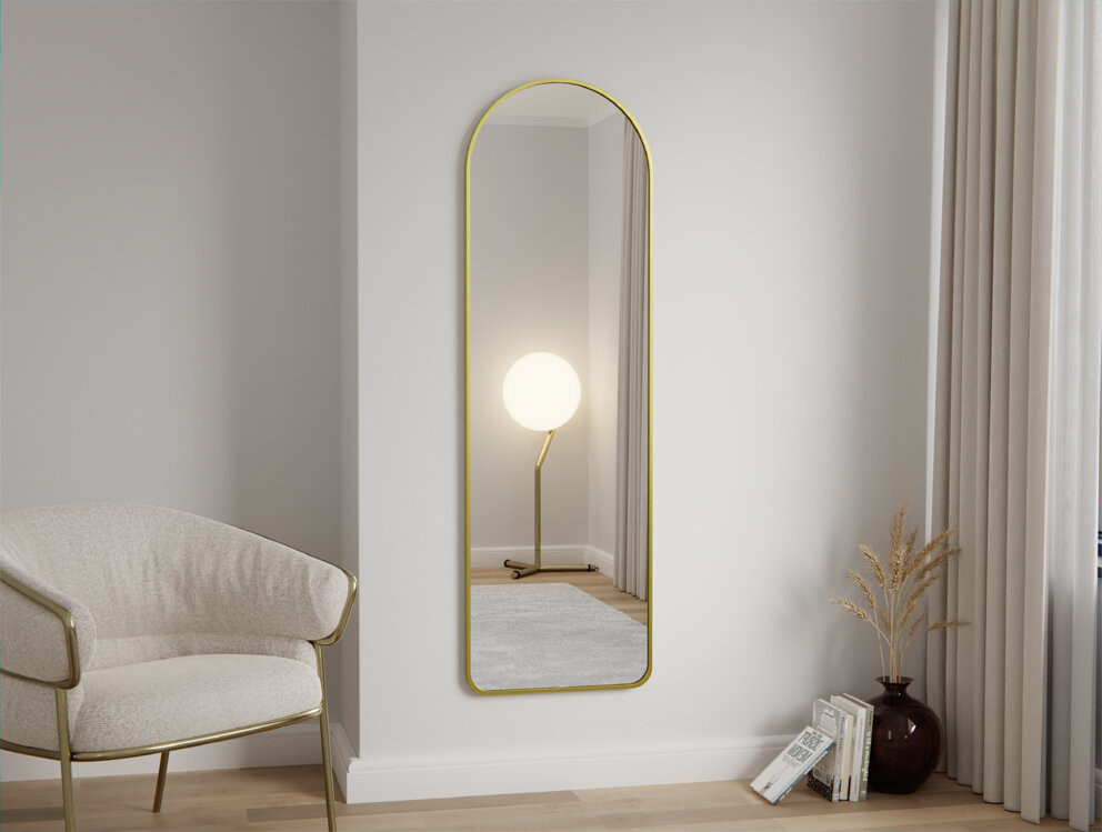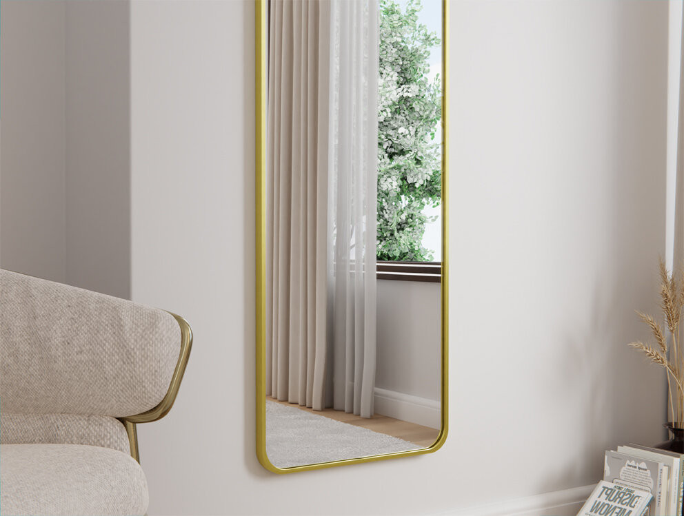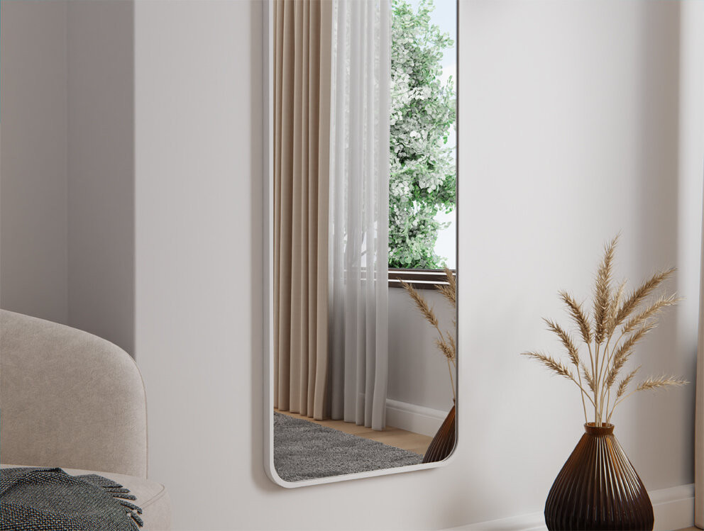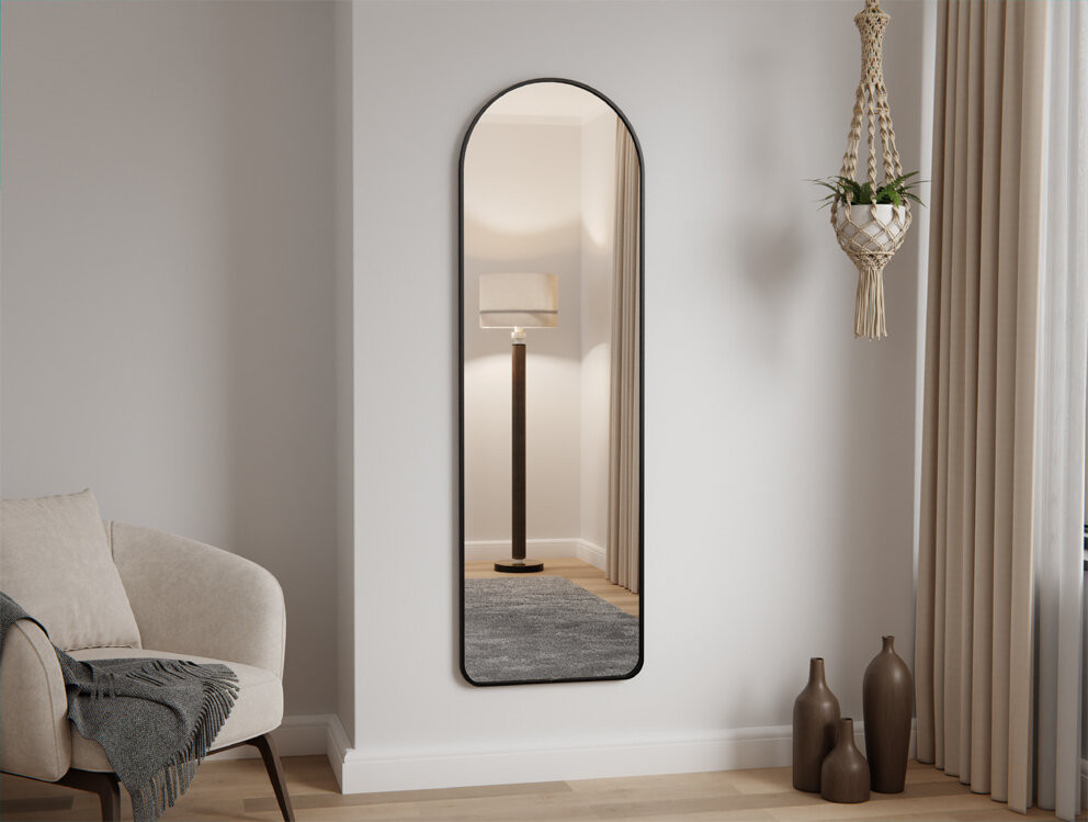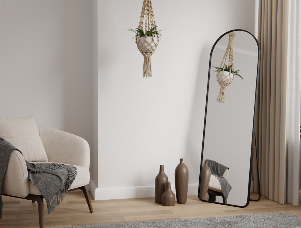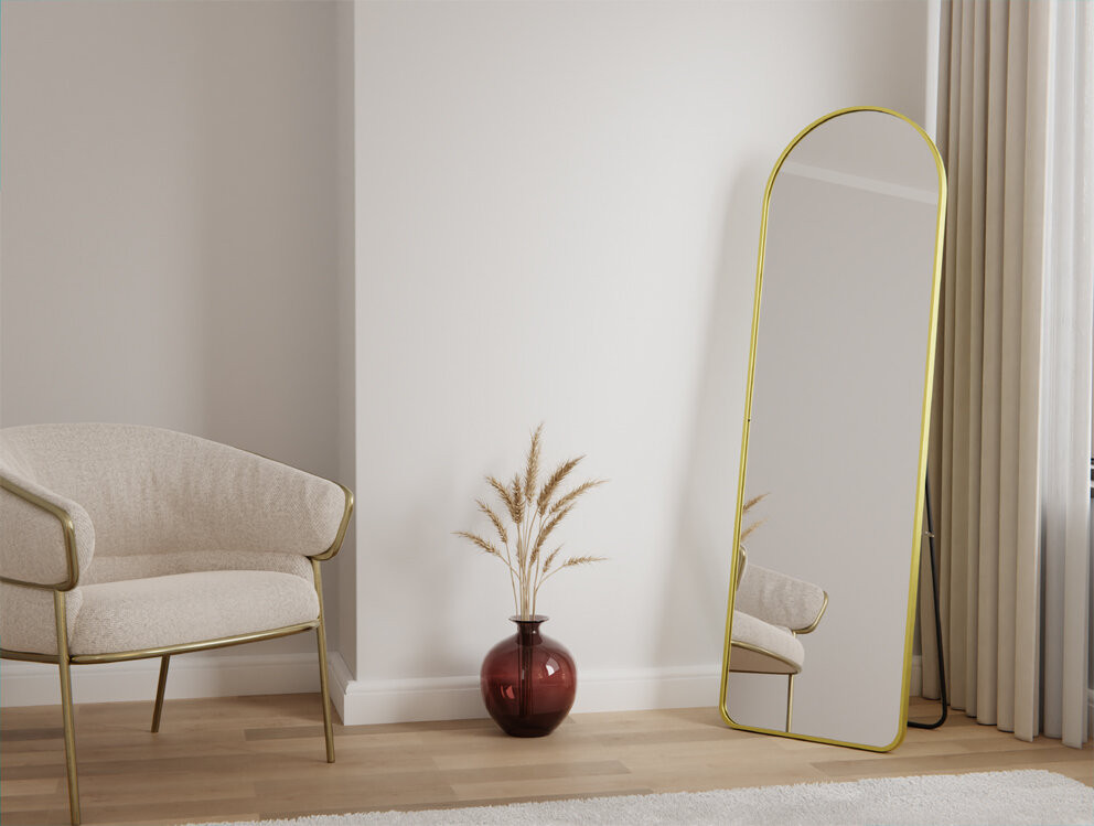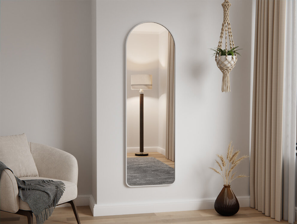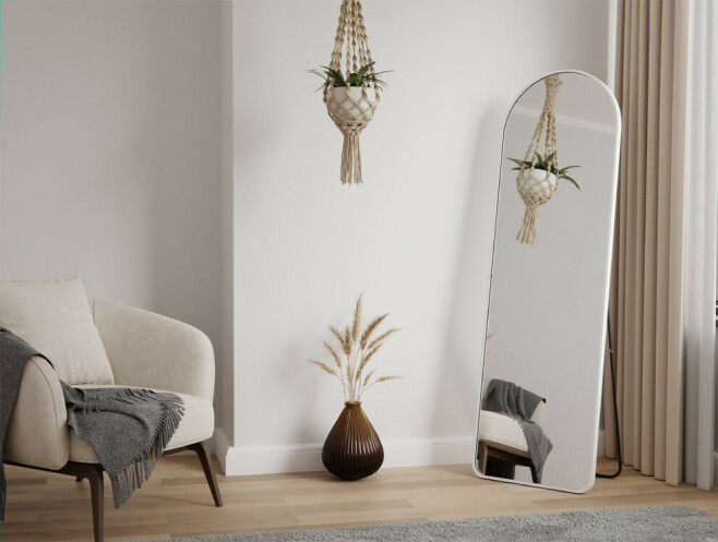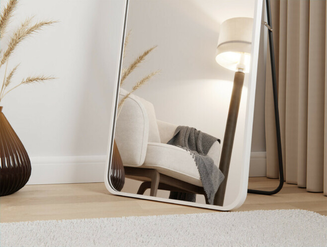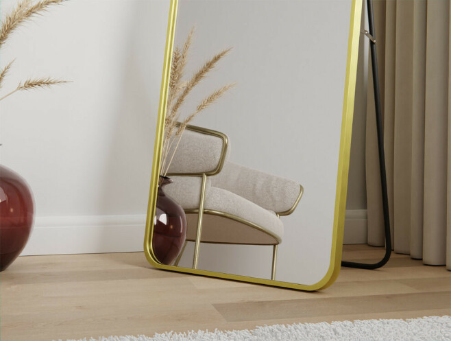 Golvspegel klädd i aluminiumram med golvstativ på baksidan. Ramen är inte bara dekorativ, utan ökar även spegelns hållbarhet och skyddar den från slag. Skulle olyckan trots det vara framme är spegelns baksida laminerad för att undvika att glaskross sprider sig i rummet. Spegeln placeras med enkelhet på golvet i husets alla rum, men kan även hängas upp på väggen med hjälp av upphängningsfästen på spegelns baksida. Välj mellan tre olika utföranden i två olika storlekar.