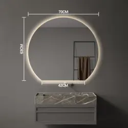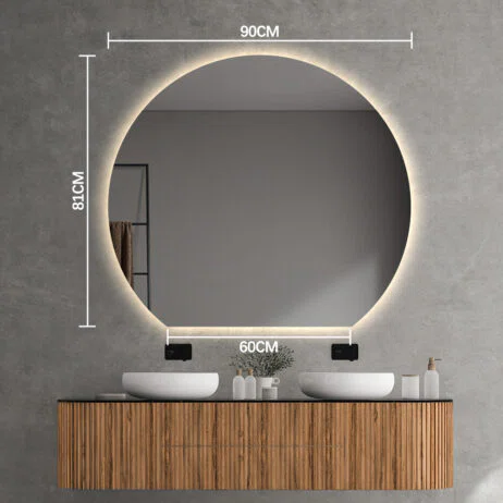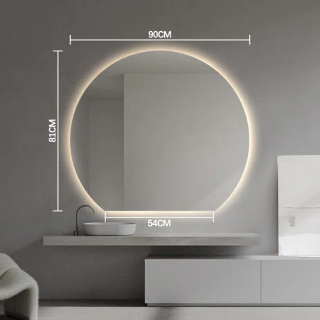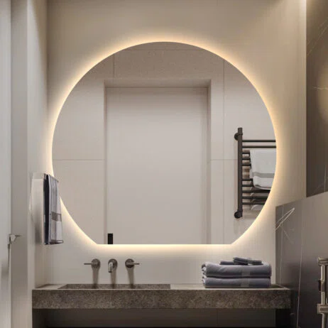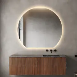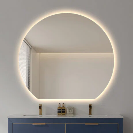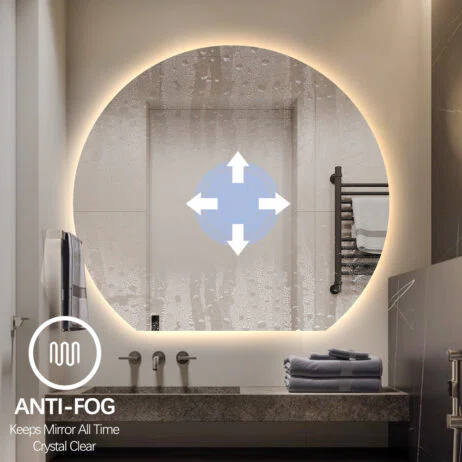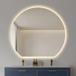 Koniseur LED-spegel med antidim som är rund med horisontal botten. En premium badrumsspegel med LED-belysning