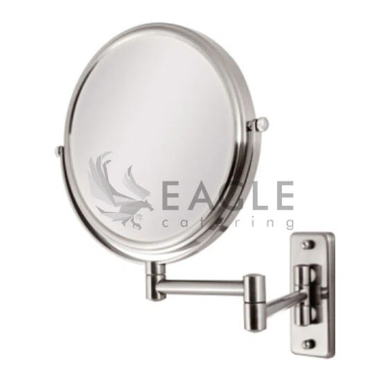 Väggmonterad sminkspegel med ledbar arm. Spegeln kan vinklas och vändas. Glasets ena sida har 1x förstoring, andra sidan har 5x förstoring. 19 cm diameter.