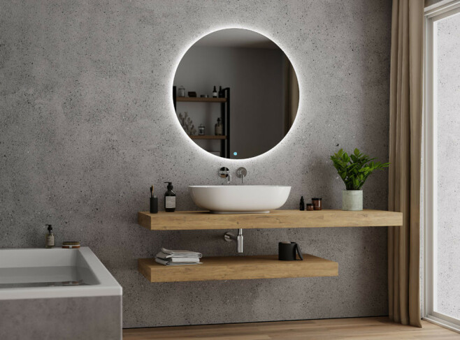 Badrumsspegel från Galakor med bakgrundsbelysning med touchsensor på spegelglaset. En perfekt lösning framför allt för badrum - men fungerar lika fint i hallen eller garderoben. LED-belysningen monteras på en aluminiumskena på spegelns baksida och bygger 25mm från vägg. LED-belysningen har 3000 kelvin i ljusflöde och är IP44-klassad för riktigt bra fuktmotstånd. Genom att hålla inne strömbrytaren på spegelglaset ljuserar du ljusintensiteten, beroende på hur stark belysning du vill ha bakom spegeln. Strömbrytaren har minnesfunktion och kommer ihåg vilken ljusstyrka som var inställd sist.