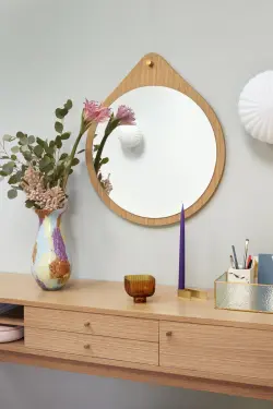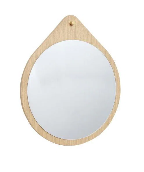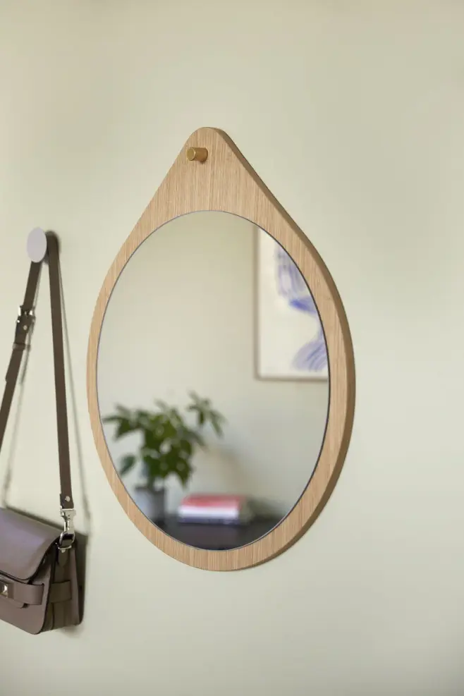 Vacker droppformad spegel från danska Hübsch. Spegeln är fäst på en skiva av FSC-certifierad ek och en mässingknopp på toppen av spegeln ger formen en extra elegant touch. Diameter: 64 cm. Med en dröm om att bygga något unikt och med passion för bra design grundades Hübsch 2010 av Flemming Hussak, Jannie Krüger och Daniel Henriksen. Sedan dess har Hübsch växt och räknas idag till en av Skandinaviens ledande märken av interiördesign.