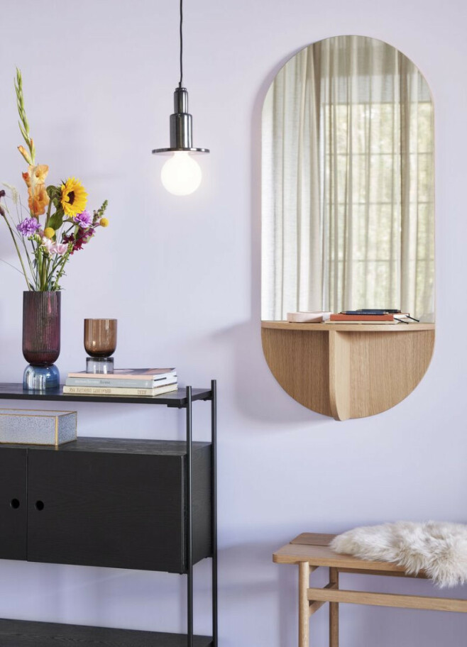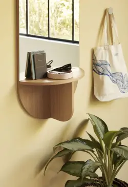 Väggspegel från Hübsch med hylla, tillverkad av FSC-certifierad ek. En smart kombination av två möbler, perfekt för entrén eller hallen. Spegeln har en modern och trendig stil, som inger en känsla av enkelhet och funktionalitet.