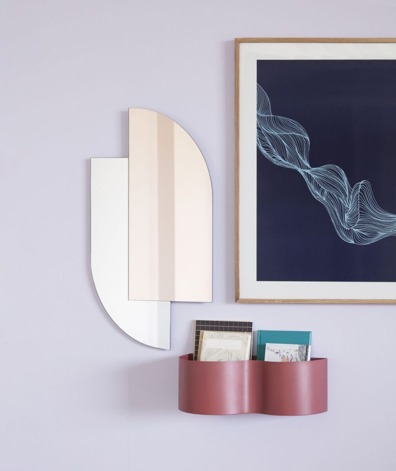 En dekorativ väggspegel som tillför ett unikt element i ditt hem. Spegelns form och kombinationen av olika färger i glaset bryter med formen på traditionella speglar och ger ett modernt uttryck. Spegeln blir ett naturligt blickfång i varje rum den hamnar i.