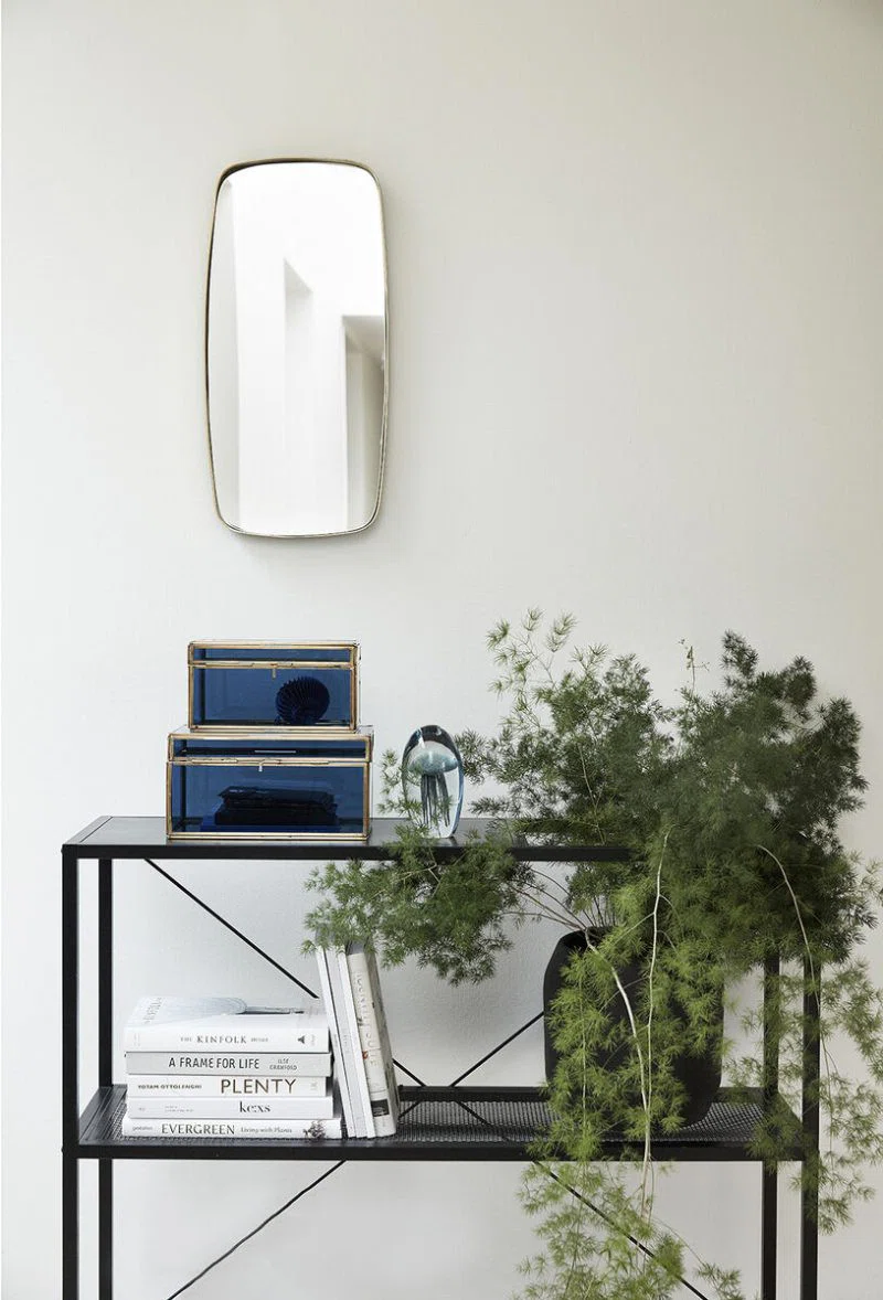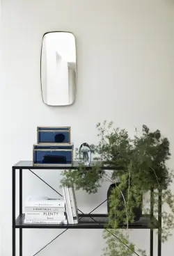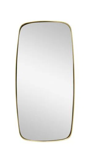 Fyrkantig, men rundad, spegel med en ram av mässing. Den neutrala designen gör att spegeln passar in i de flesta rum. Ramens material ger spegeln en vintage-känsla.