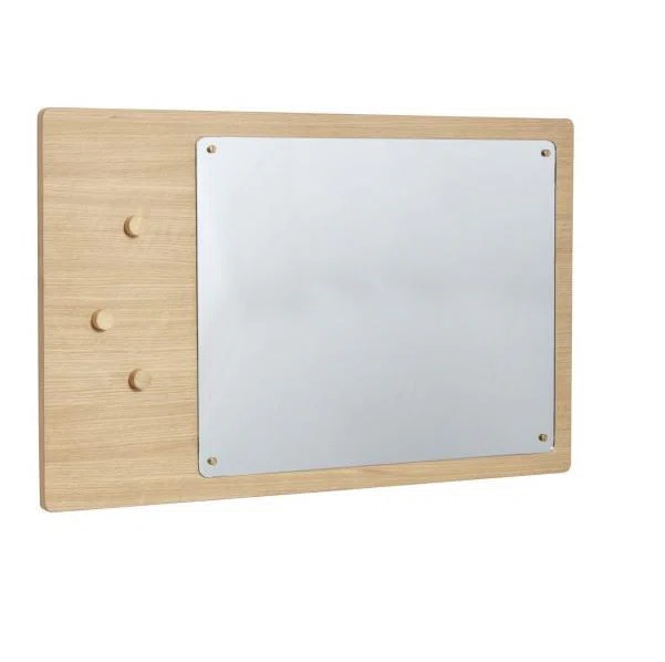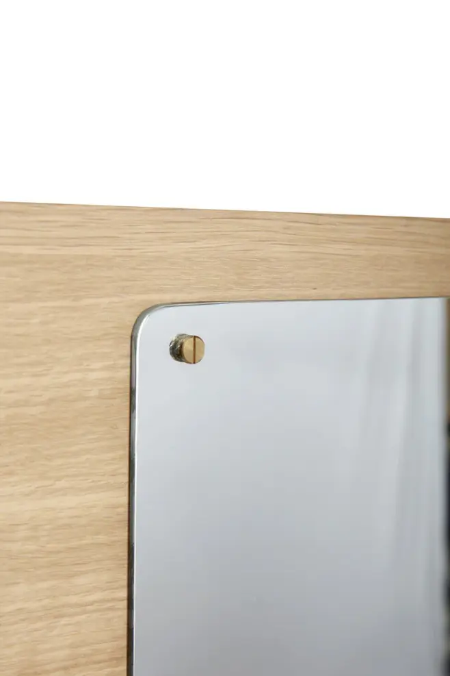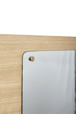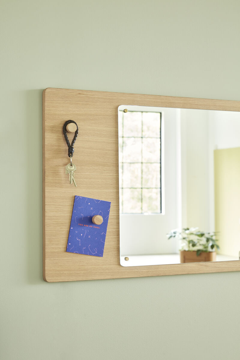 Spegel på ett ark av ekfaner, med en anslagstavla med hjälp av dold magnetisk yta bredvid spegeln. Ett dekorativt stycke inredning för kontoret, vardagsrummet eller där både spegelbilden och viktiga noteringar kan mötas.
