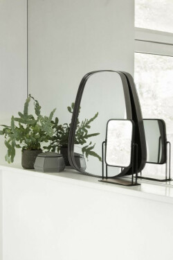 Väggspegel från Hübsch i trapetsform med mjuka, rundade hörn. Hängs enkelt upp eller vilar säkert mot en hylla eller möbel. Spegelns järnkant både skyddar spegeln mot slag och stötar, samtidigt som det blir ett inslag av rått material.