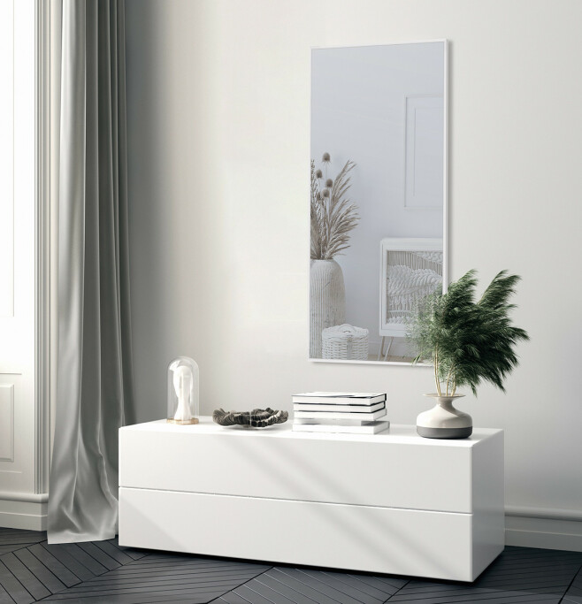Klassiskt utformad spegel med en diskret ram av vitt aluminium. Med sin tidlösa färg och form går spegeln aldrig ur mode och blir därmed en säker framtidsinvestering. Spegeln görs i många olika storlekar och former, som gör att den passar i husets alla rum.