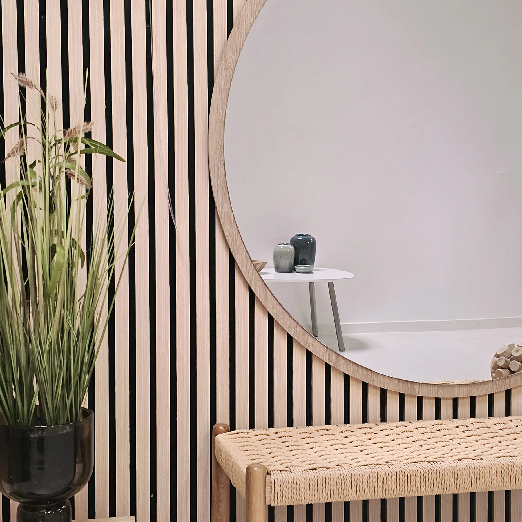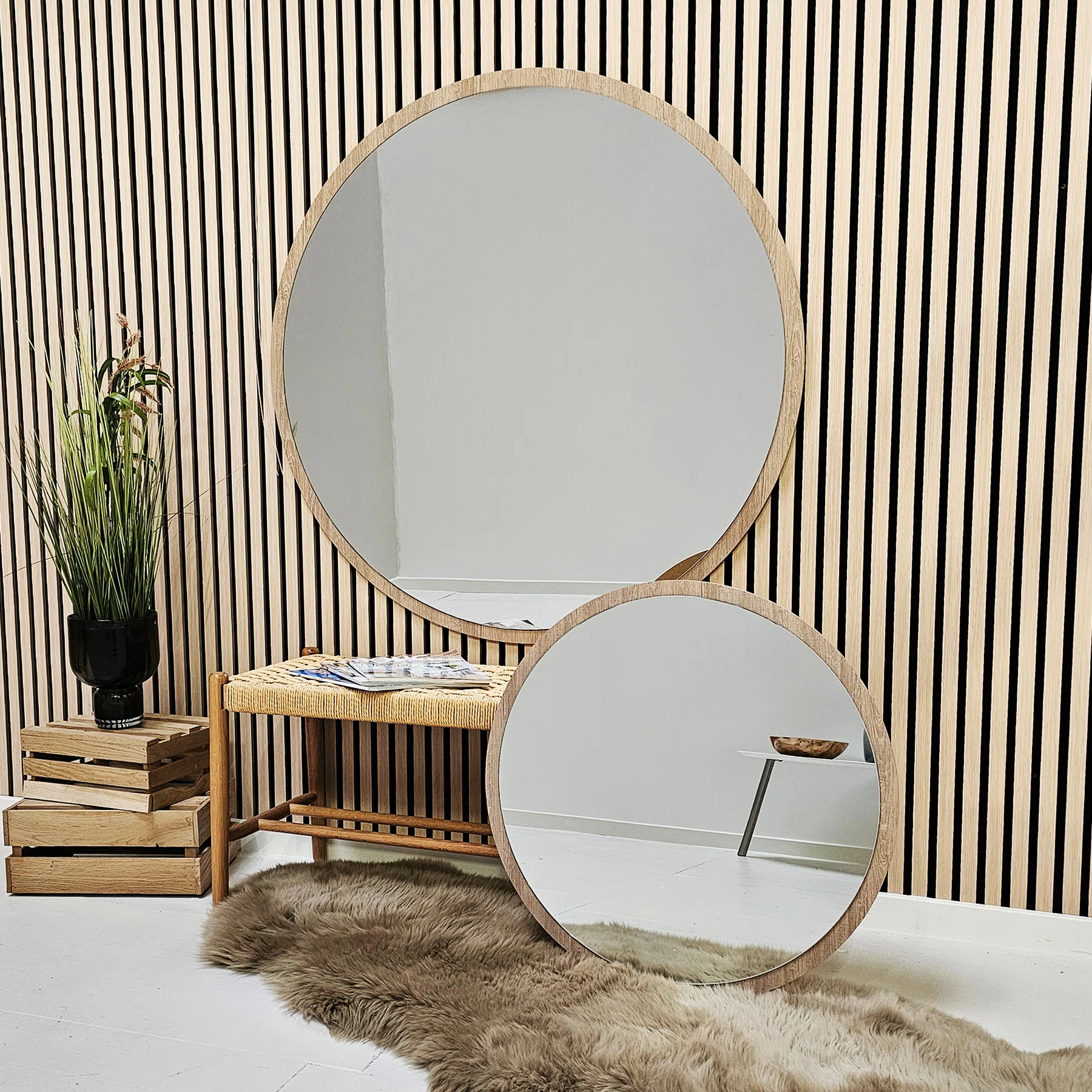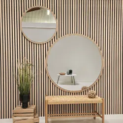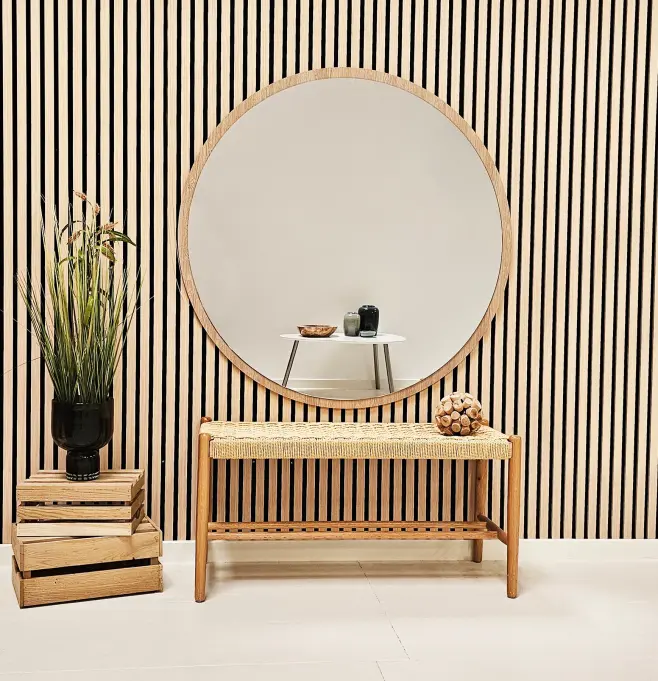 Woody Wood från INCADO är en rund spegel fäst på en MDF-skiva med en ytterkant av ekfanér. Spegeln blir ett perfekt komplement i skandinaviskt inredda rum, där naturmaterial och ljus inredning ofta går hand i hand. Den eleganta profilen lyfter fram spegelns karaktär, som skänker en skvätt elegans. Oavsett om spegeln placeras hallen, sovrummet eller vardagsrummet blir spegeln en diskret påminnelse om lyx i hemmet.